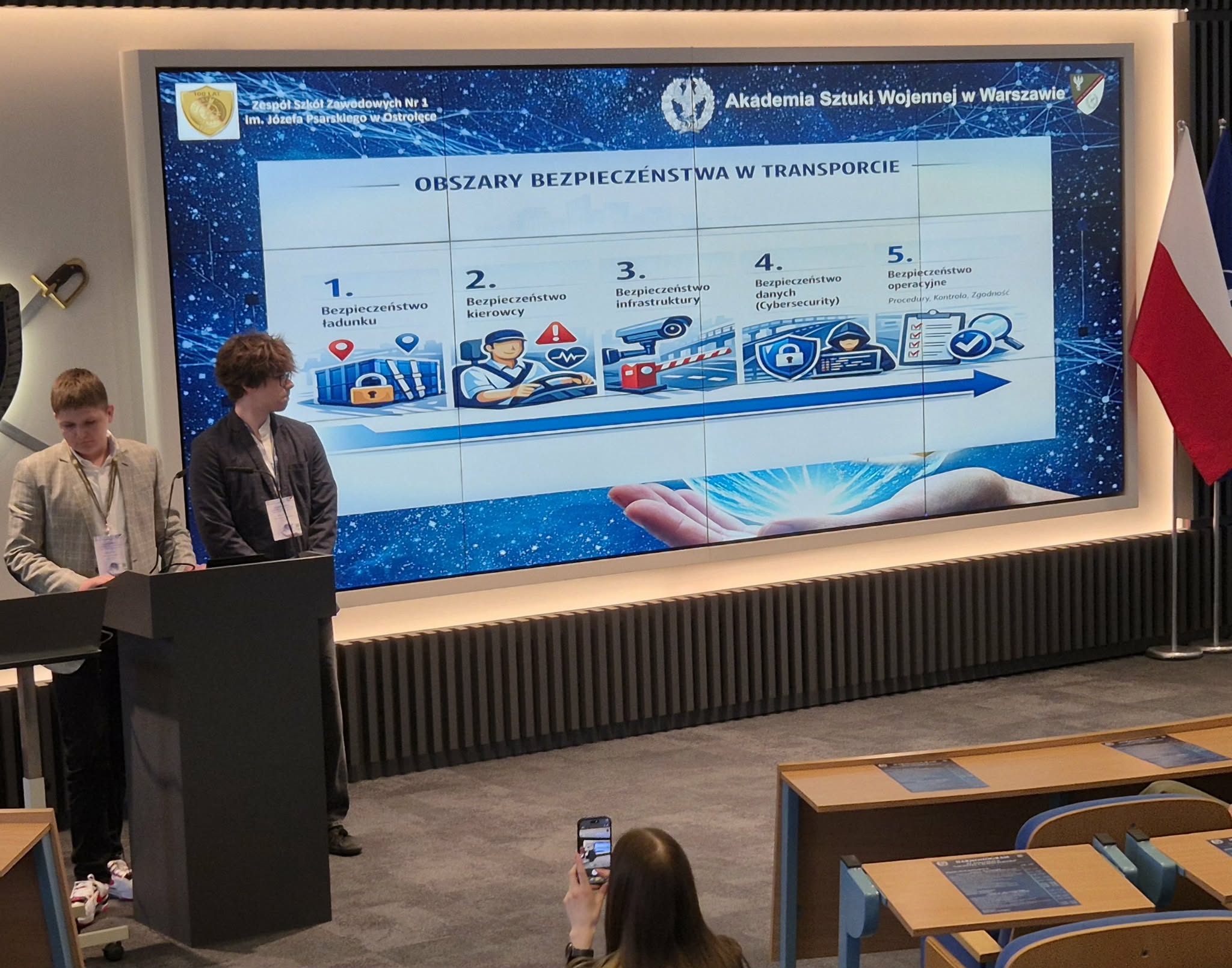 W Panelu I, dedykowanym uczniom szkół średnich, naszą szkołę reprezentowali Jakub Chełstowski i Mieczysław Grochowski z klasy 2P – technik logistyk. Pod opieką merytoryczną pana Jana Rzewnickiego zaprezentowali temat „Systemy bezpieczeństwa w transporcie: od monitoringu łańcucha dostaw po technologie antykolizyjne”, zdobywając wysokie II miejsce w ogólnopolskim konkursie konferencyjnym.