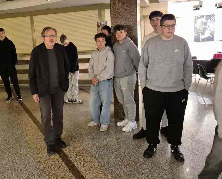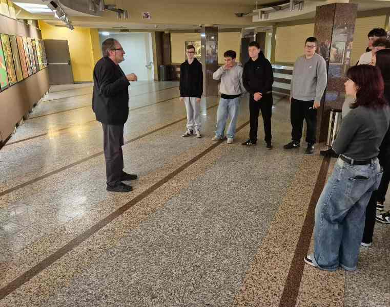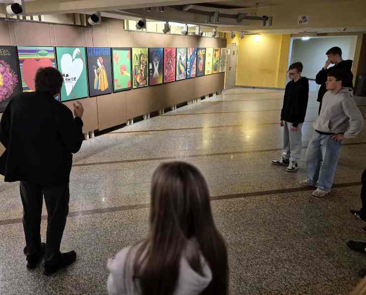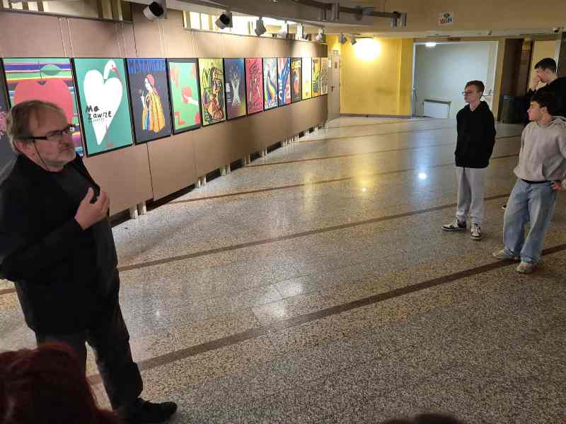Podczas zwiedzania wystawy uczniowie mieli wyjątkową okazję wysłuchać komentarza Pana Zenona Kowalczyka – Kierownika Galerii Ostrołęka, który osobiście oprowadzał grupę po ekspozycji. Pan Kowalczyk z pasją i zaangażowaniem opowiadał o każdym plakacie, przybliżając kontekst jego powstania, technikę wykonania oraz przesłanie artystyczne. Dzięki jego opowieściom uczniowie mogli głębiej zrozumieć ideę wystawy i spojrzeć na Mazowsze oczami artystów z różnych kultur.